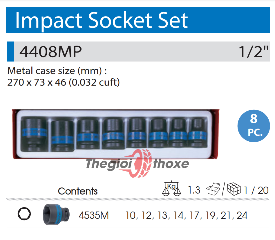 - Bộ đầu khẩu 1/2 inch 4408 MP rất phù hợp cho các đầu khẩu nối tuýp ½ có kích thước từ 10-24mm. Bao gồm: 8 khẩu tuýp 10, 12, 13, 14, 17, 19, 21, 24 mm. Đặc biệt, trong lượng cả hộp chỉ 1.3 kg, có thể mang theo để sử dụng khi cần thiết, nhỏ gọn, tiện lợi cho lúc sử dụng và cất giữ.