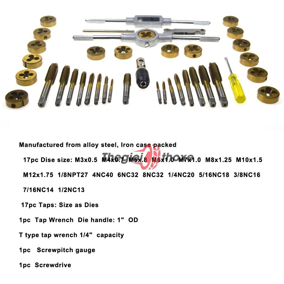 Bàn ren Taro: M3x0.5, M4x0.7, M5x0.8, M6x1.0, M8x1.25, M10x1.5, M12x1.75, 1/8NPT27 4NC40, 6NC32, 8NC32, 1/4NC20, 5/16NC18, 3/8NC16, 7/16NC14, 1/2NC13