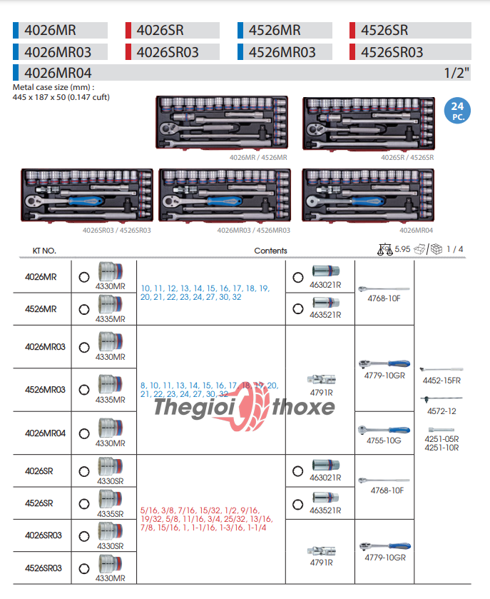 Bộ tuýp kingtony 1/2 hoa thị 4026MR01 hay còn được gọi là “bộ khẩu mở siết ốc, bộ tuýp Kingtony, bộ tuýp mở ốc, bộ tuýp lục giác, bộ khẩu vặn ốc” với nhiều tên gọi được sản xuất tỉ mỉ với sự kết thành của 24 chi tiết lớn nhỏ được liệt kê như sau: