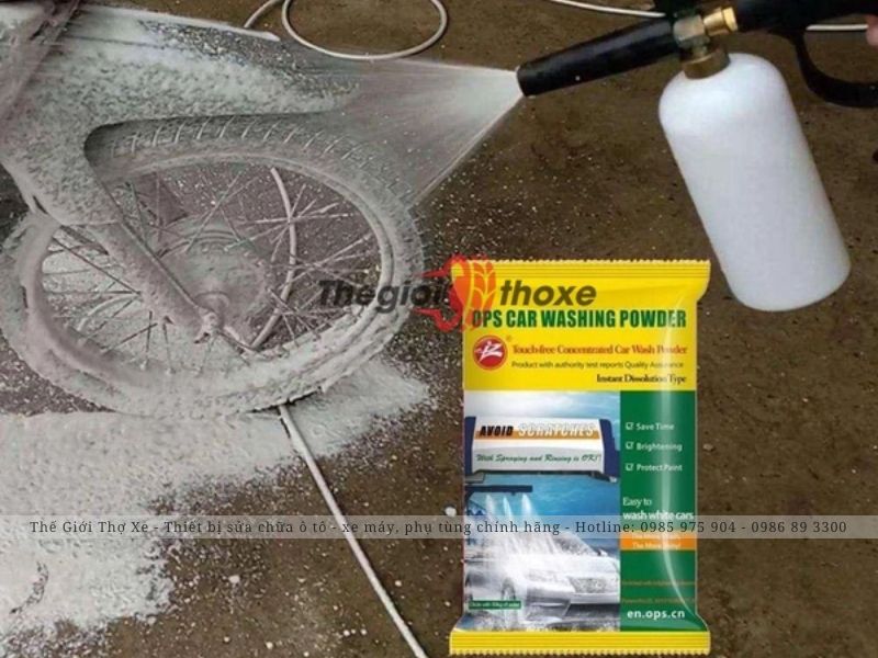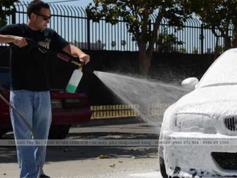 Tiến hành làm ướt bề mặt xe trước, sau đó phun bọt tuyết lên toàn bộ bề mặt xe. Đợi trong một thời gian cho vết bẩn bị mềm ra thì lấy khăn hoặc chổi mềm để lau sạch xe.